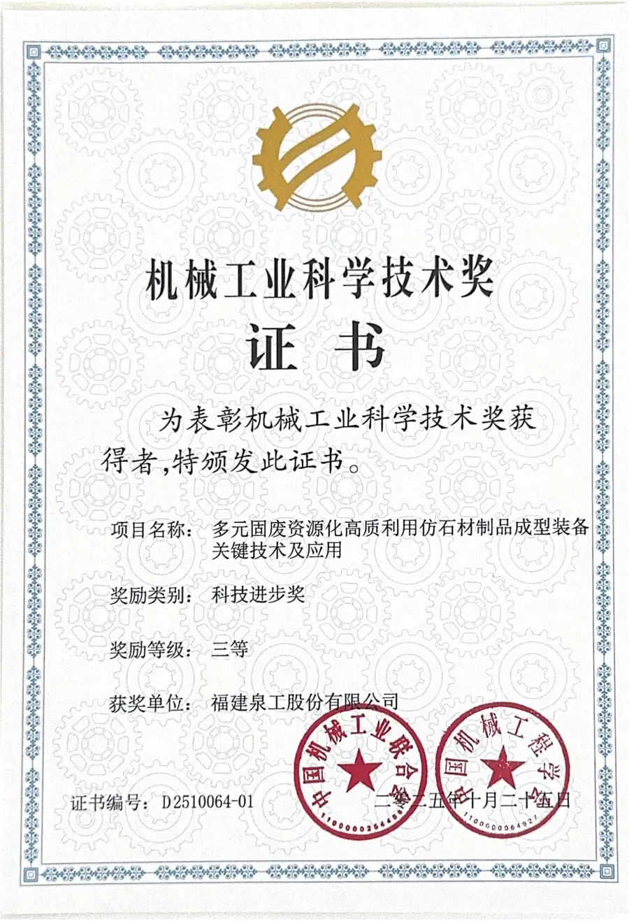 Le déanaí, fógraíodh go hoifigiúil liosta na mbuaiteoirí don Dámhachtain Eolaíochta agus Teicneolaíochta Tionscal Innealra tSín 2025. Bhuaigh an tionscadal "Eochairtheicneolaíochtaí agus Feidhmchláir Trealamh Foirmithe le haghaidh Úsáid Ard-Luach Acmhainní Dramhaíola Soladach Éagsúlaithe i dTáirgí Cloch Insamhladh," faoi stiúir Fujian Quangong Machinery Co., Ltd, an tríú duais as dul chun cinn teicneolaíochta. Léiríonn an dámhachtain seo go hiomlán an t-aitheantas ard doCo Innealra Quangong, Teo.cumais nuálaíochta teicneolaíochta agus éachtaí feidhmithe innealtóireachta i réimse úsáid ardluacha acmhainní dramhaíola soladacha agus trealamh foirmithe cliste le haghaidh táirgí cloiche insamhladh.